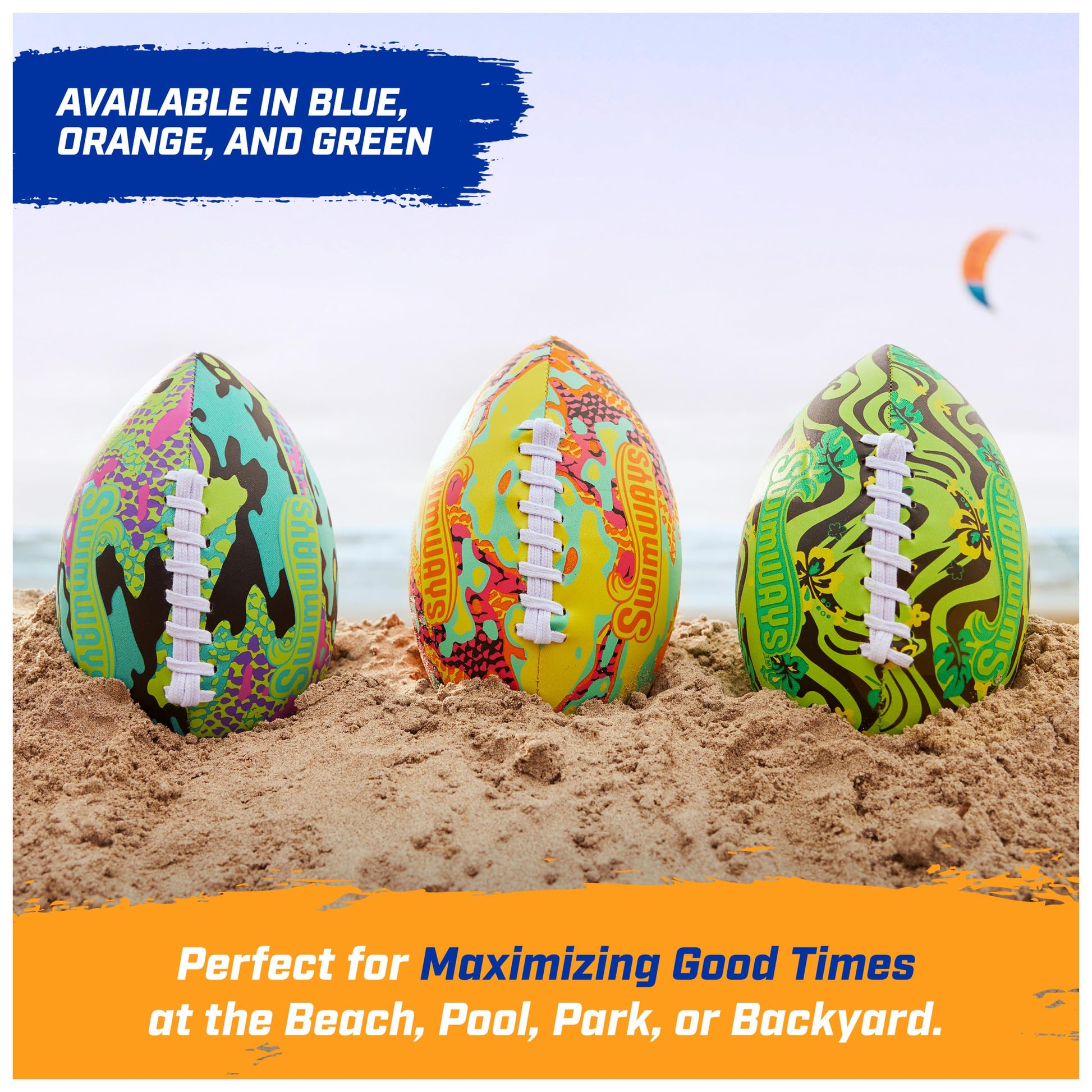Details: Take your game to the backyard, pool or beach with the Swimways Hydro Football! The 9.25" football is 100% waterproof for uninterrupted play in all conditions. Double-tuck laces make throwing easier with incredible grip in or out of the water. The soft cover screams fun with its bright colors and on-trend graphics, and the heavy duty stitching and long-lasting air retention bladder provide consistent performance. Includes 1 football in either orange, blue or green. Recommended for ages 5 and up.