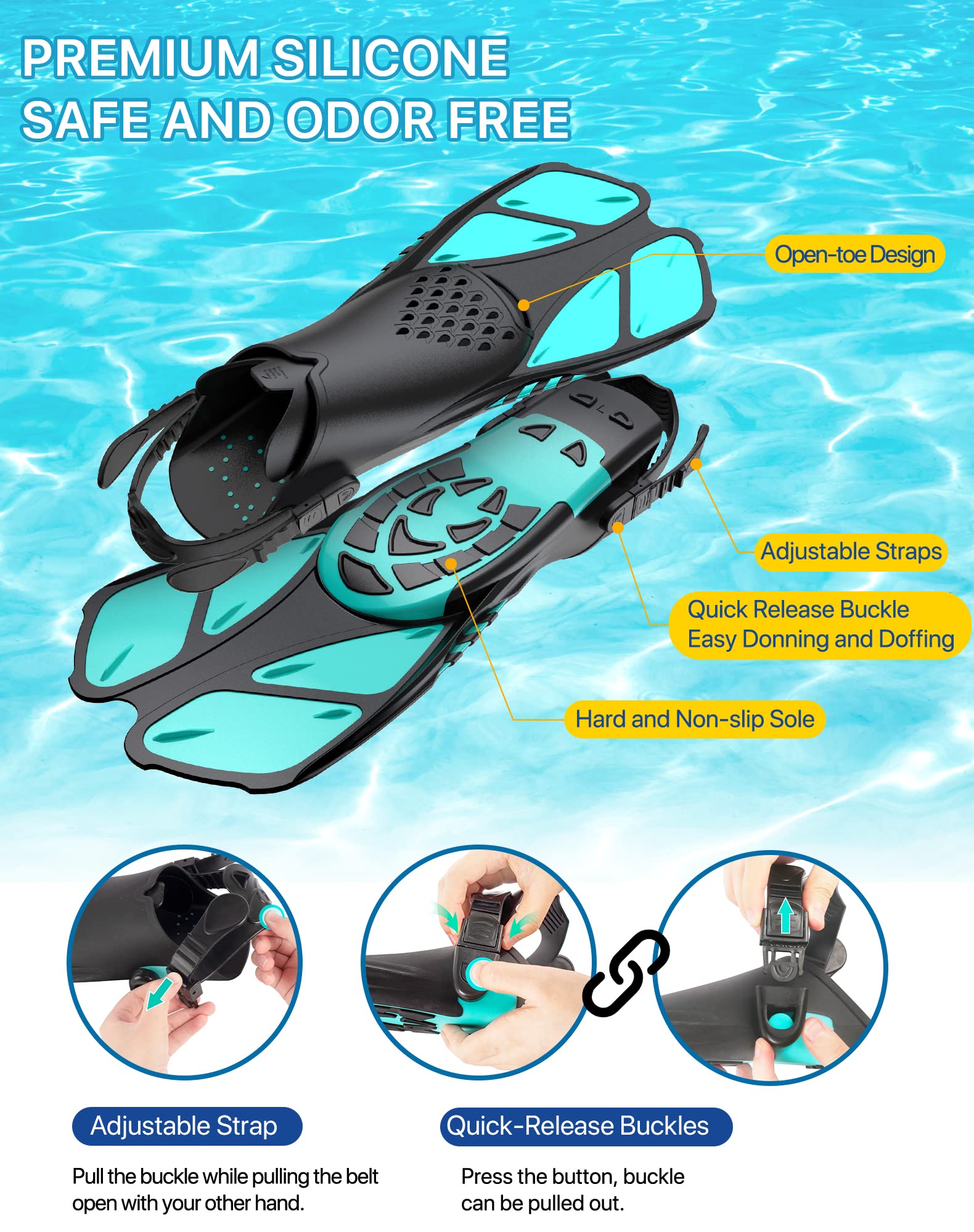 • 【Mask Fins Snorkel Set for Adults】4 In 1 snorkel set with adjustable fins,tempered glass lens mask, dry top silicone snorkel,travel gear bag,it's the ultimate travel companion and is suitable for snorkeling,swimming,scuba diving and other water activities.