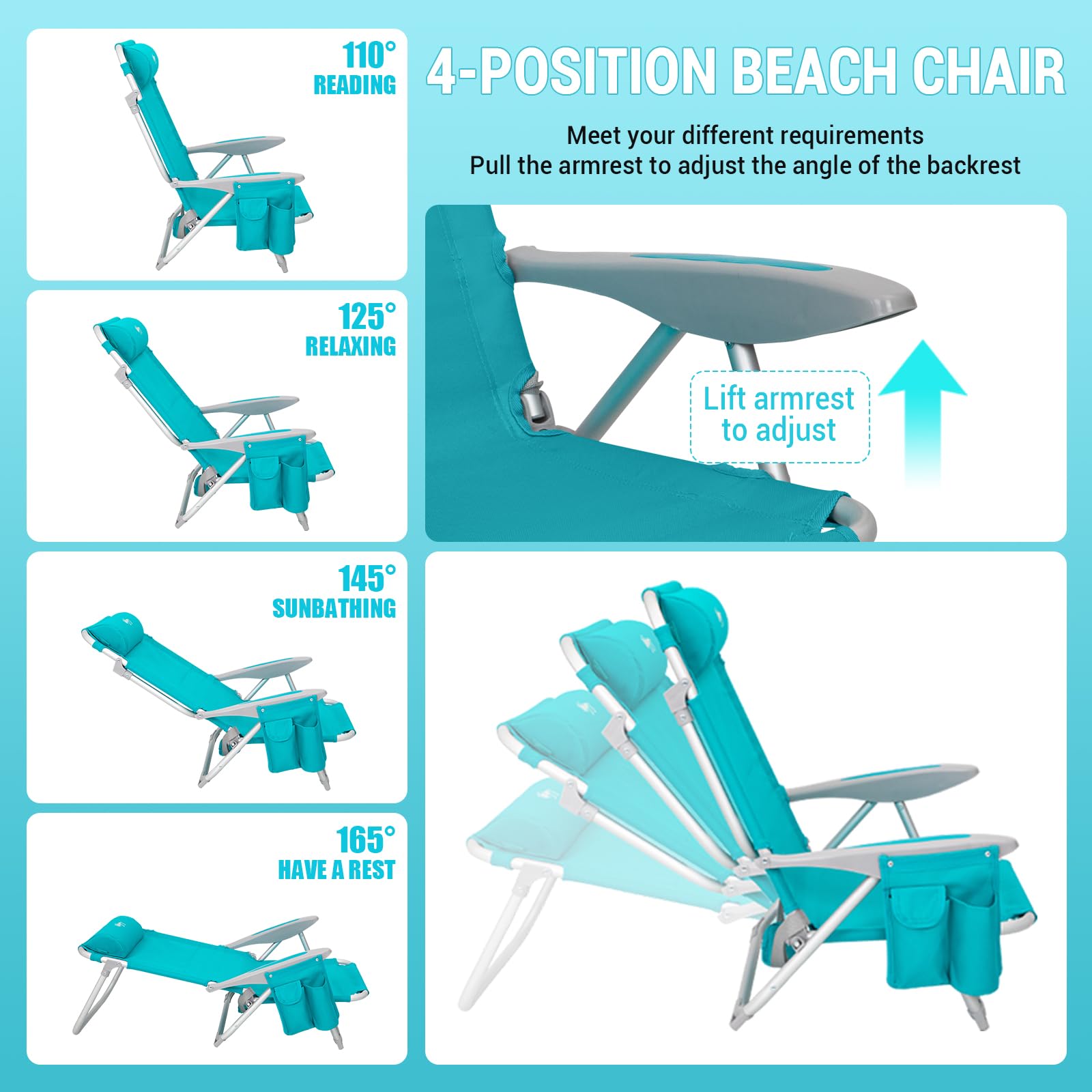 #WEJOY Lightweight Low 2 Pack Beach Chair for Adults, 4-Position Aluminum Folding Camping Chairs with Backpack Strap, Cup Holder and Padded Headrest, Supports 265lbs for Lawn Outdoor Cyan